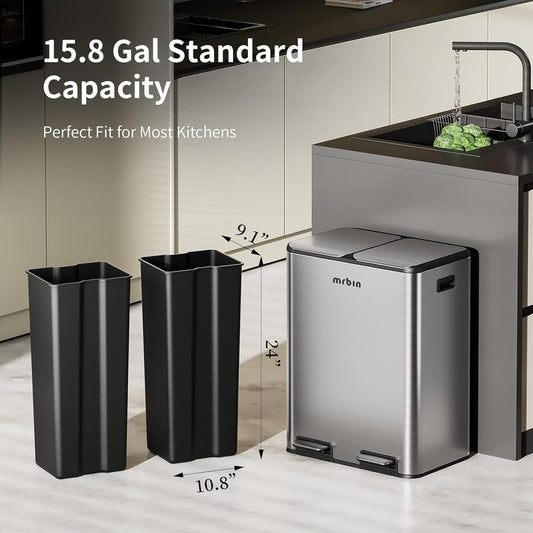 Dual Trash Can Recycling Bin Combo Stainless Steel, 60L / 16gal Large Kitchen Garbage Pail with Lid, 2 x 8 Gallon (2 x 30 Liter) Tall Large Step Rectangle Double Compartment Sided Waste Basket