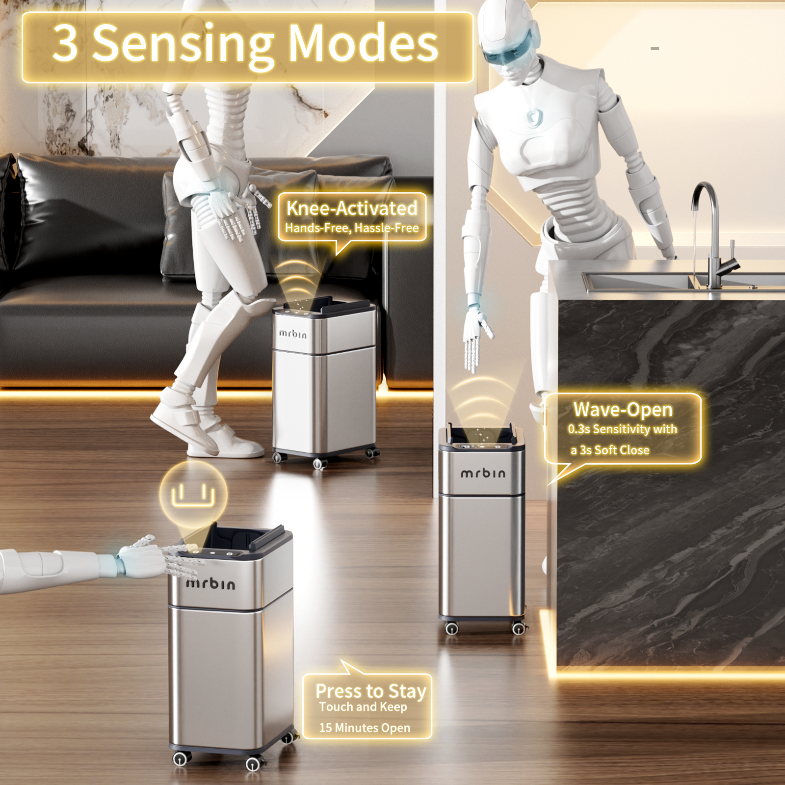 - Smart Opening: The touchless vanity trash container offers multiple opening options to suit your needs. You can open it with a simple button press, a gentle knee nudge, or a wave of your hand. The button press also allows you to hold the lid open for continuous use.