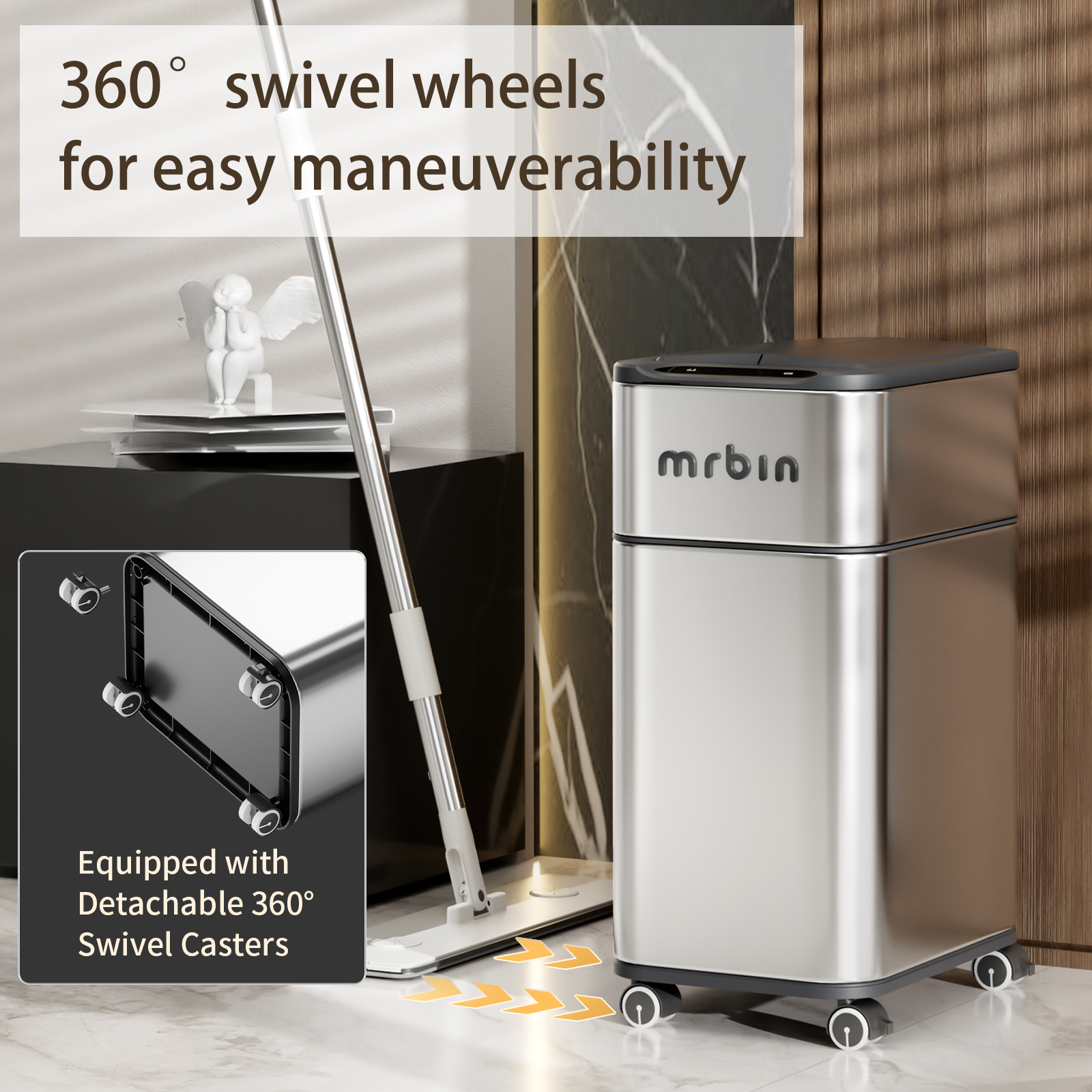 - Snap-On Swivel Wheels: Four quick-detach casters let you roll this toilet dustbin wherever it’s needed—restroom, living room, kitchen, or vanity. Flip the built-in brake tabs, and the wheels lock instantly when you want it to stay put.
