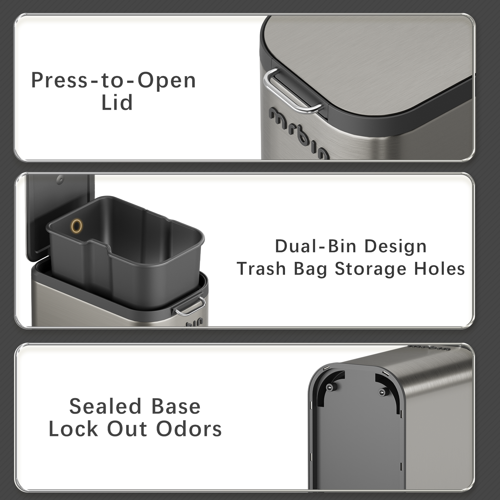 - Dog proof design: The trash can with a Press-to-Open Lid for easy opening and closing, which not only offers convenience for users but most importantly, prevents pets from accessing the trash can. This design keeps your home cleaner and your pets safer